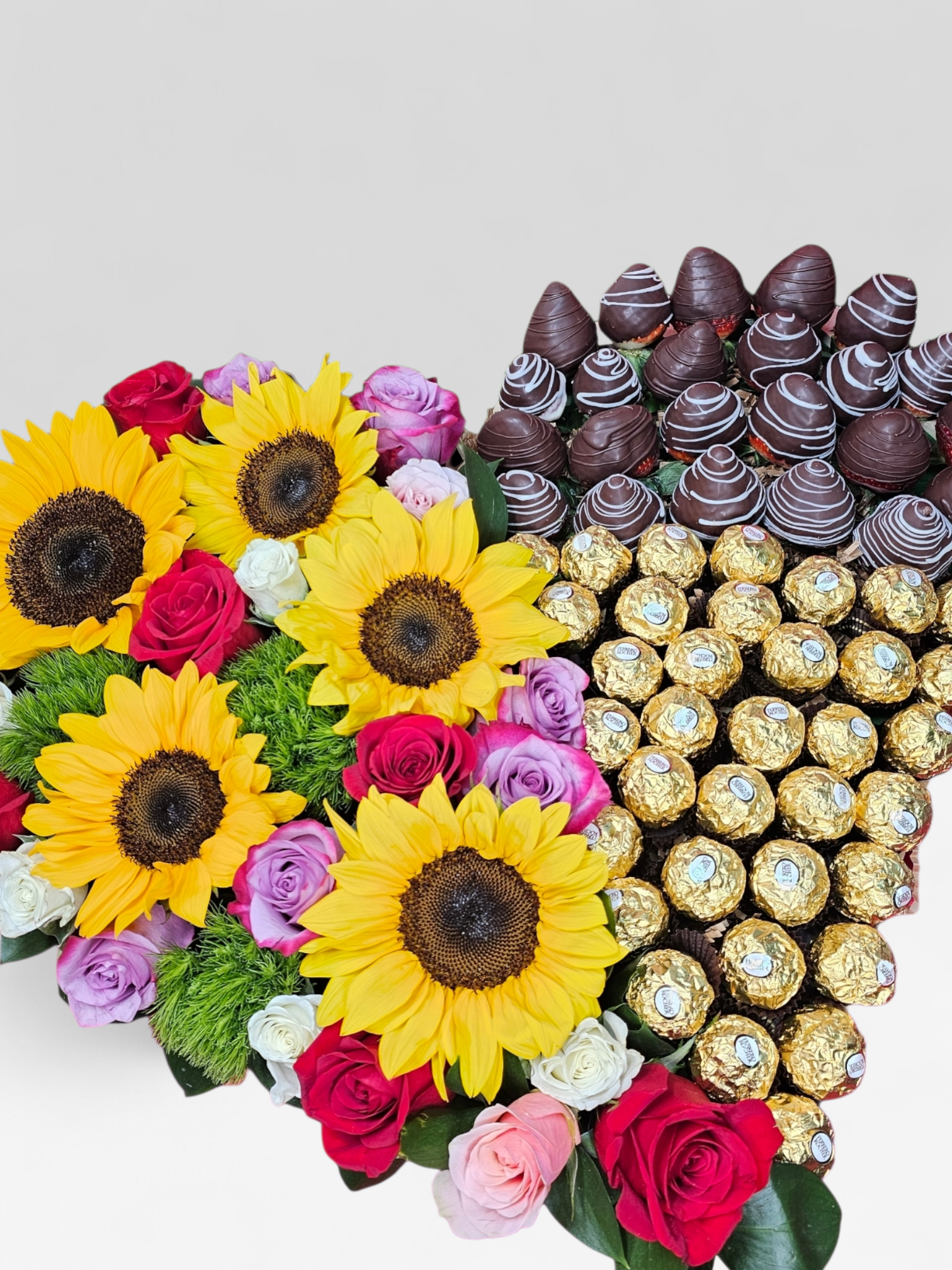 Un imponente arreglo en forma de corazón que reúne la pasión de las rosas, la alegría de los girasoles y la delicadeza de flores surtidas, acompañado de exquisitas fresas cubiertas de chocolate y finos chocolates Ferrero Rocher.
